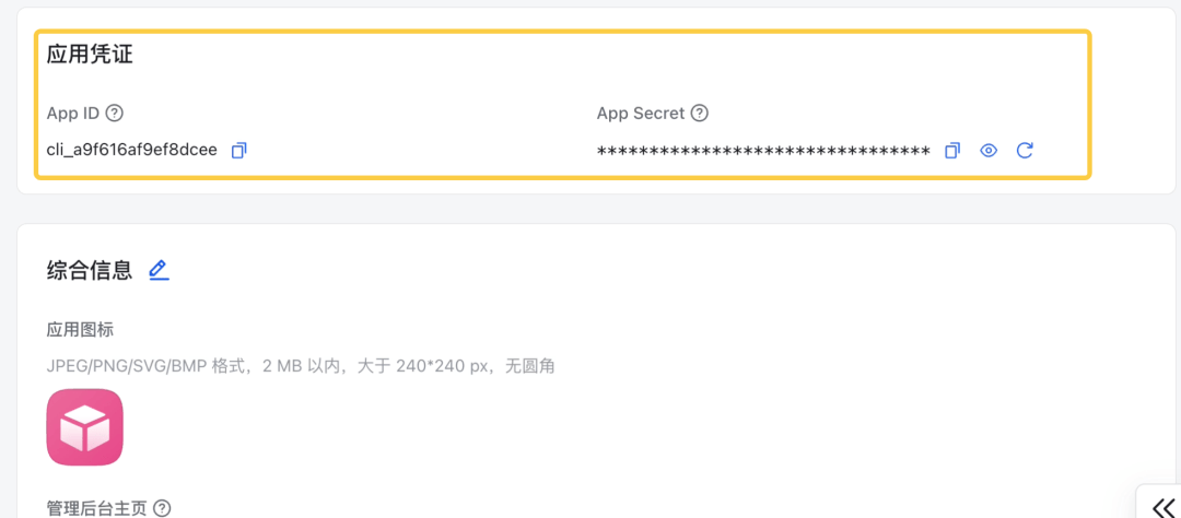 在应用详情页点击“凭证与基础信息”,复制以下信息: