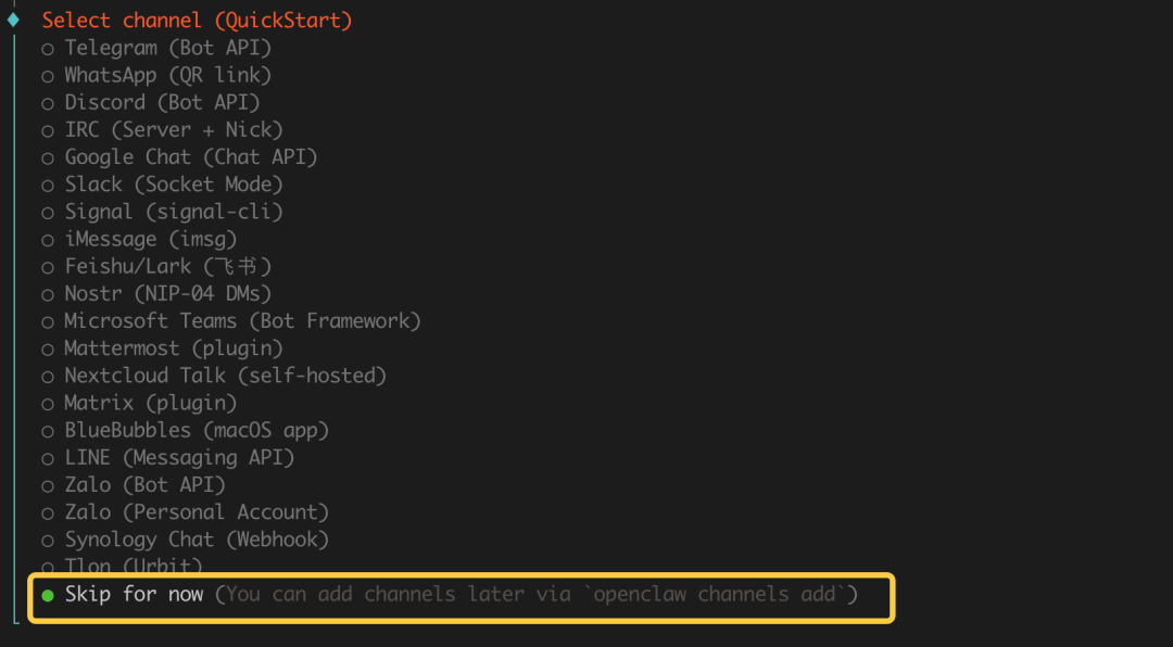 5. Channel 配置 -> 选 `Skip for Now` (跳过)