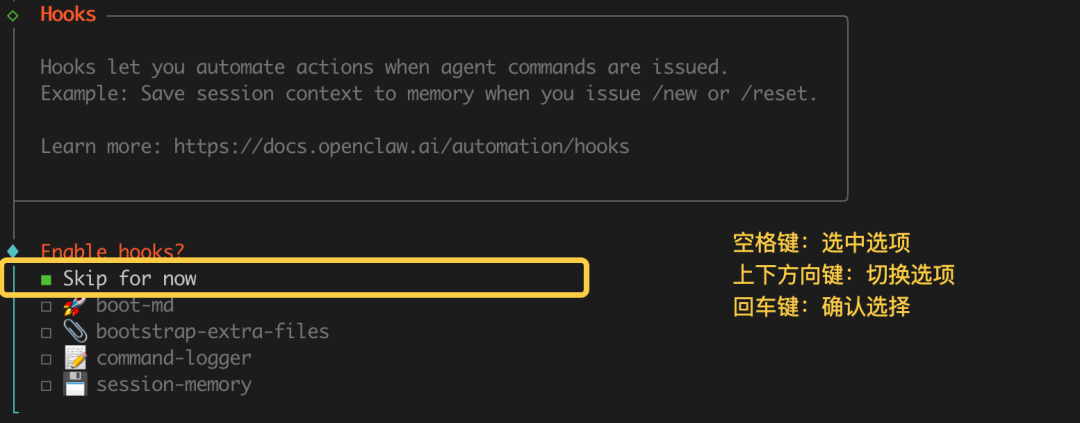 7. Hooks 钩子 -> 选 `Skip for Now` (跳过)